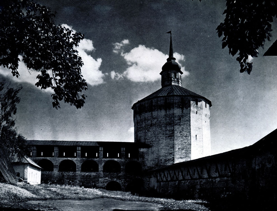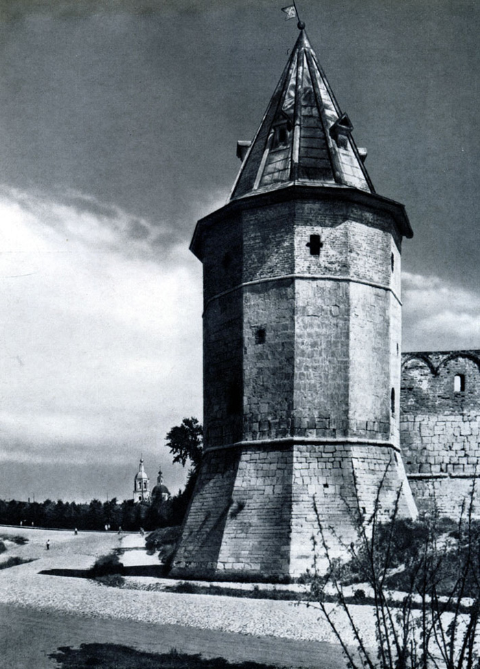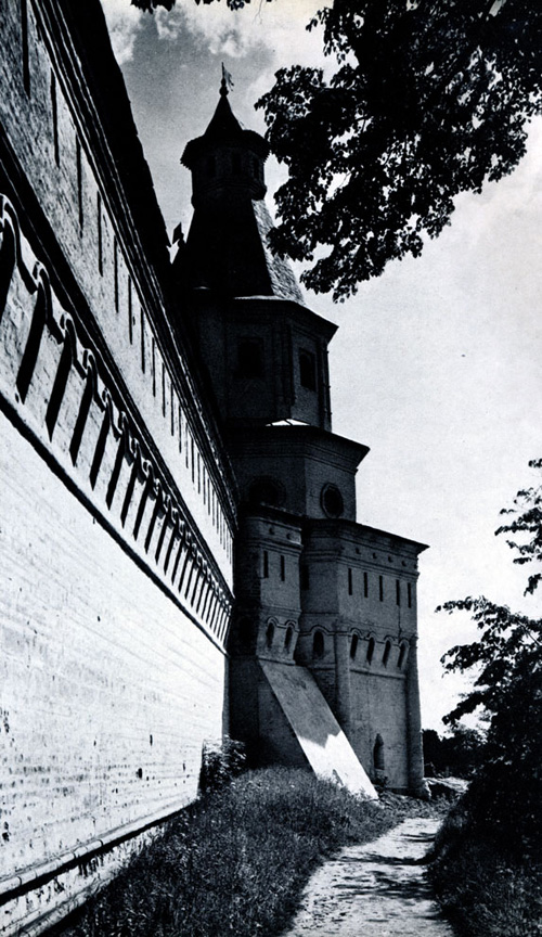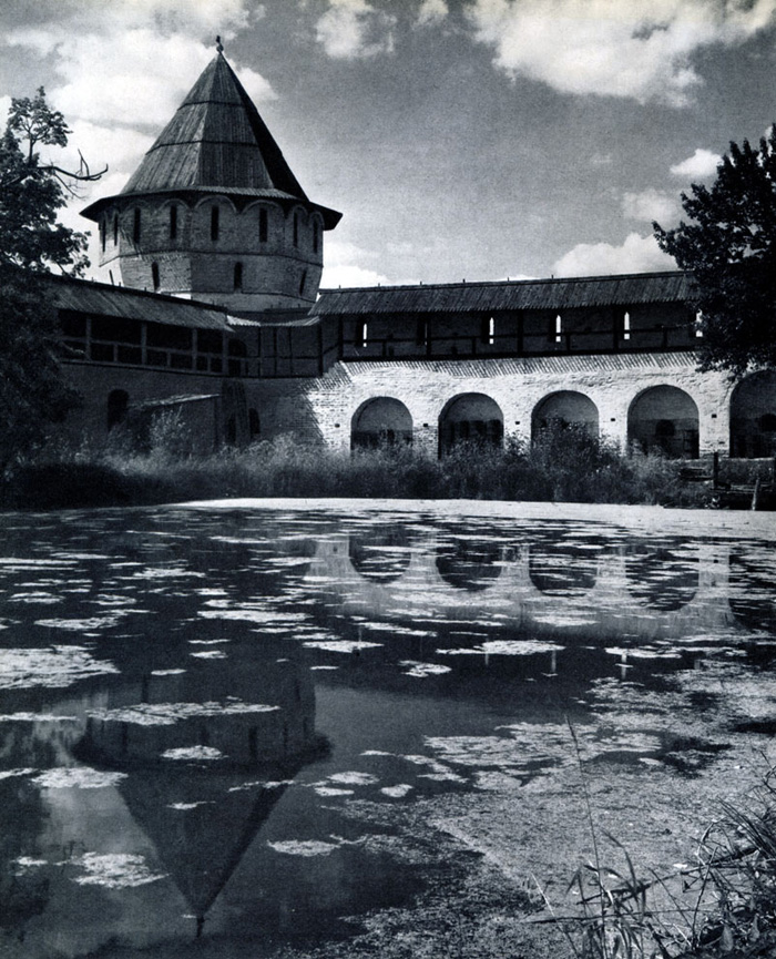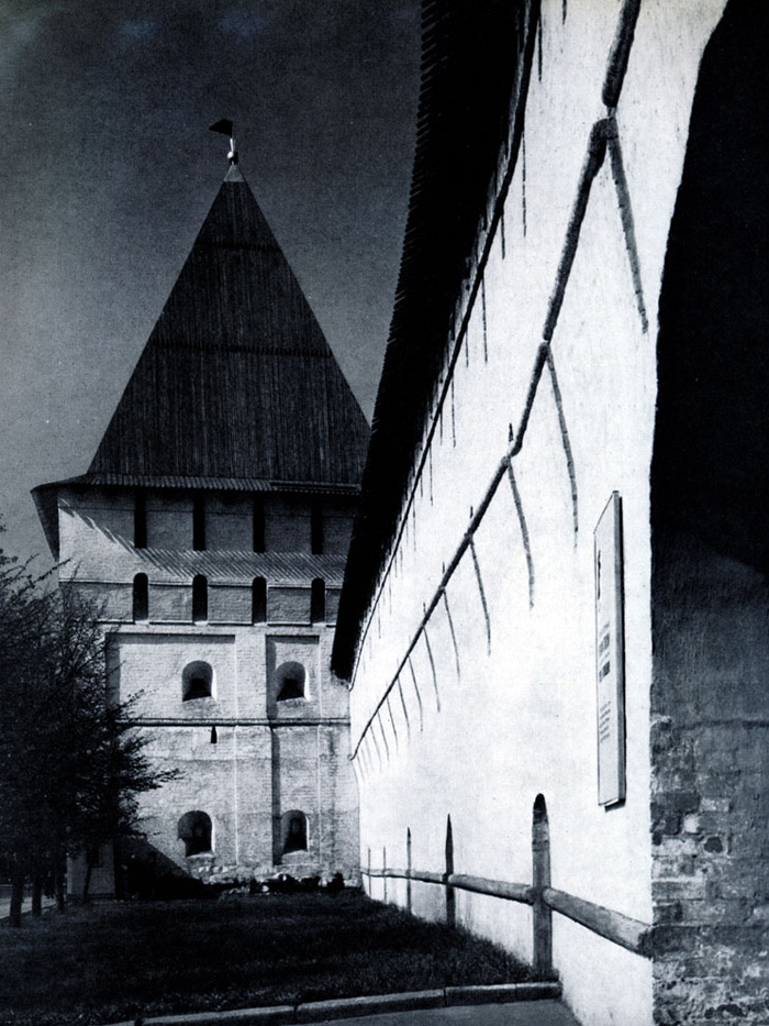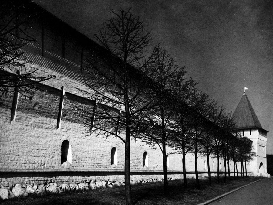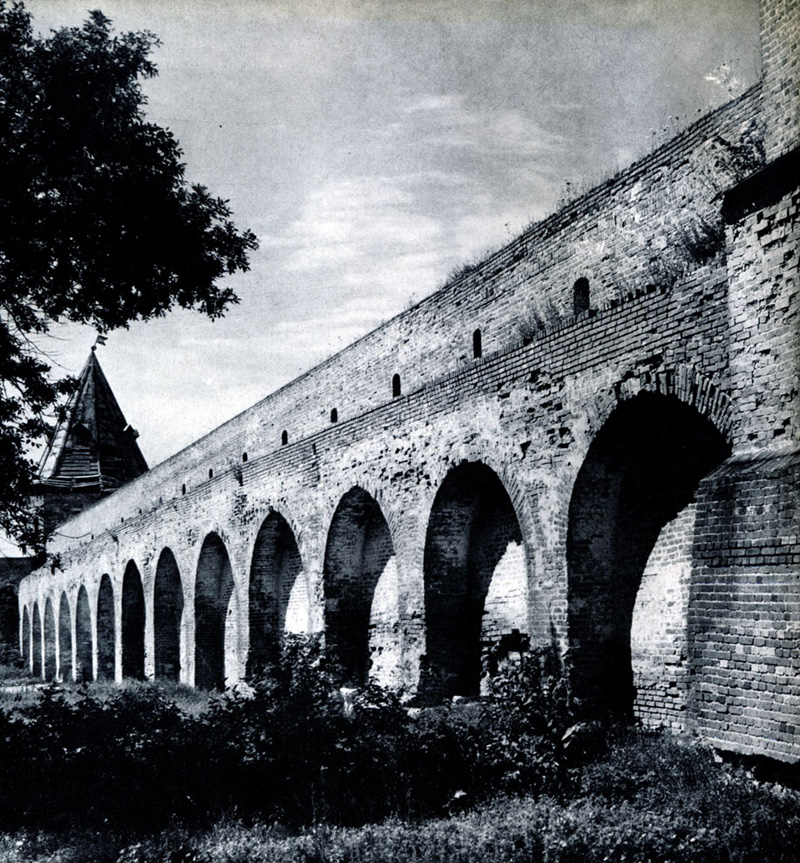 Конечно, не все оборонительные сооружения древней Руси сохранились до наших дней. Большинство из них уже давным-давно исчезло с лица земли. Однако те, которые остались, являются великолепными памятниками архитектуры. Своей суровой лаконичностью нас поражают, например, каменные твердыни в Изборске — верном порубежном страже вольного Пскова, названном врагами за неприступность «железным городом», а также в Порхове и Копорье — пограничных укрепленных пригородах «Господина Великого Новгорода», не раз обрекавшихся неприятелем на разрушение. Могучей силой и вечной нерушимостью веет от стен и башен величественного Кремля Москвы — крепостного первенца молодого Русского государства, вступившего при Иване III на международную арену. Грандиозна и крайне своеобразна Смоленская крепость, которую русский народ окрестил «непобедимым укреплением своего отечества». Словно сказочные города вырастают из земли стены и башни Соловецкого, Троице-Сергиева и Кирилло-Белозерского монастырей — «великих царских крепостей», соединяющих в себе техническое совершенство исполнения и изумительную, нигде не повторимую красоту.