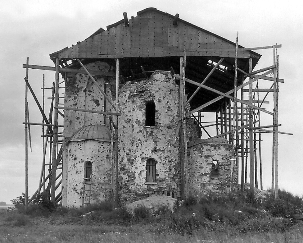 Для окончательного разрешения вопроса из церкви были взяты для исследования в лаборатории Института Археологической Технологии образцы осыпавшихся красок и покрывавших в некоторых местах стены органической слизи и выцветов. Лабораторное исследование с несомненностью установило, что причиною порчи фресок оказались водоросли cyanophyceae и chlorophyceae (сем. chroococcaceae, pleurococcaceae и protococcaceae), обильно заселившие некоторые места стен в виде больших темно-зеленых и черных пятен. Водоросли эти, вместе с вторично развившимися на подготовленной почве грибком aspergillus, penicilium, mucor и др. микроорганизмами, образовали на стенах слизистую пленку, трескавшуюся при отмирании клеток и захватывавшую при своем осыпании краски фресок [См. Доклад Заведывающего петроградскими музеями о деятельности петроградского Отдела музеев по охране памятников искусства и старины и музейному строительству. „Музей“, Петроград, 1923, т. 1, стр. 5, пр. 1; Отчет Председателя Комитета по охране и ремонту монументальных памятников. „Музей“. Петроград, 1924, т. 2, стр. 10; Отчет Н. С. Анерт о ремонтно-реставрационных работах в Новгороде летом 1920 г.; Доклад В. А. Щавинского в Разряде живописной техники и технологии красок. Известия Института Археологической Технологии, вып. II, Ленинград, 1924, стр. 28 сл.]. Результаты исследования потребовали срочного удаления цементной облицовки. Для удаления ее в 1919 г. вокруг церкви были сооружены специальные леса, предназначенные также и для предохранения стен от действия атмосферных осадков. Первоначально обнаженная от цементной облицовки часть южной стены показала, что около 50% всей стены было облицовано новым кирпичом на цементном растворе (1:3). Дальнейшие работы выяснили, что не только все стены и своды церкви были покрыты цементной облицовкой, но и то, что цемент был глубоко внедрен внутрь новых кладок. При рассмотрении вопроса о возможности удаления этих кладок, крепко связанных с древними, местами изветшавшими кладками, решено было во избежание возможных сотрясений, могущих гибельно отразиться на состоянии фресок, новые кладки не удалять, а ограничиться отбивкой по особо установленному способу лишь цементной штукатурки по всему фасаду и тщательной прочисткой швов древней кладки от цемента. Работа, исполнявшаяся мелкими зубилами и небольшими молоточками, потребовала много усилий и времени, так как новая штукатурка оказалась большой толщины и крепости. Во избежание сотрясений штукатурка удалялась не сразу, а в два приема, причем после окончания отбивки производилась прочистка древних швов особыми металлическими щеточками. Одновременно с очисткой стен от цемента шли работы по фотографированию древних кладок, точному их обмеру и зарисовыванию акварелью. В итоге работ по фотографированию и обмерам явились 127 снимков, 14 чертежей со старых и 14 чертежей с новых кладок. Таким образом едва ли не впервые удалось так полно зафиксировать великолепный образец древней кладки великокняжеского периода и ее позднейших деформаций.