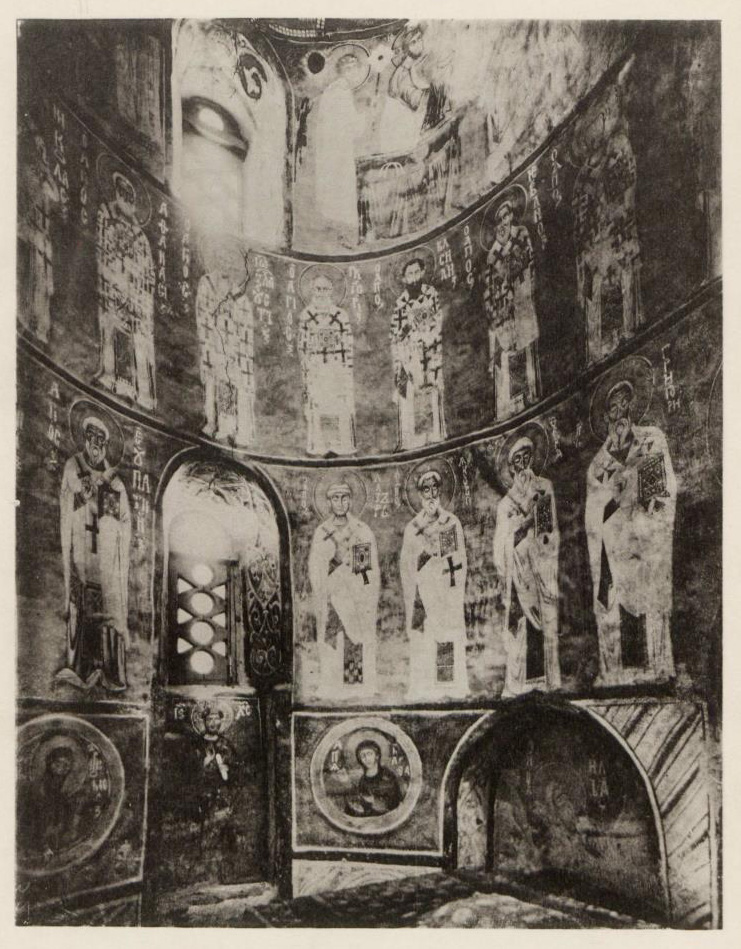 Далее следует отмстить, что в Передние Богородица-Оранта в апсиде представлена уже с медальоном младенца Эммануила на груди, как в мозаиках Вифлеемской базилики, исполненных в 1169 г. и во многих росписях XIV—XV ст.