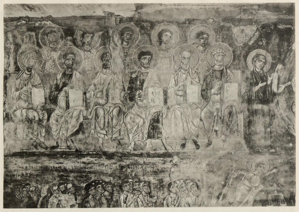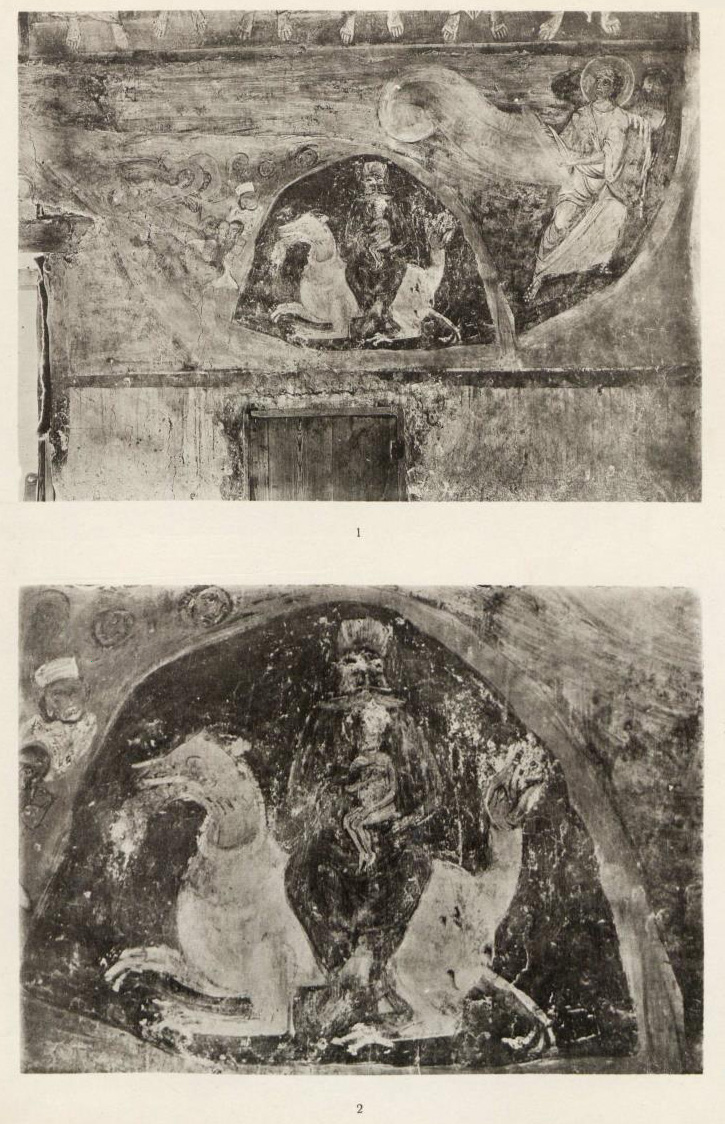 Наконец, остается отметить еще два пошиба. Один из них отличается очень странной не византийской драпировкой складок и плоскими, почти сплошь забеленными лицами и напоминает некоторые романские фрески Бриксена, а особенно те фрески, которые были недавно открыты в церкви S. Croce di Gerusalemme в Риме. Другой пошиб, очень грубый и неискусный, имеет большие точки соприкосновения с росписью капеллы Quattro Coronati в том же Риме.