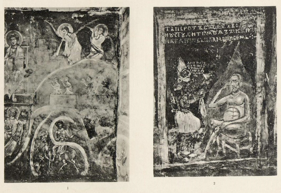 Прежде всего, это — обилие изображений ангелов. Кроме Михаила и Гавриила, написанных по обычаю на восточном своде, мы видим в каждом люнете, северном, южном и западном, вместо отдельных сложных композиций, по колоссальной поясной фигуре архангелов — Рафаила, Уриила и Селафиила. Мало того, в люнете восточной стены жертвенника помещена фигура херувима, а в нижнем поясе диаконика — изображение шестикрылого серафима в медальоне. Подобное обилие ангелов, необычное в других памятниках, мне известно только в некоторых росписях М. Азии, где оно может быть объяснено местным высоким почитанием сил небесных, особенно же архистратига Михаила.