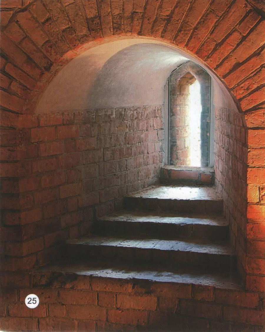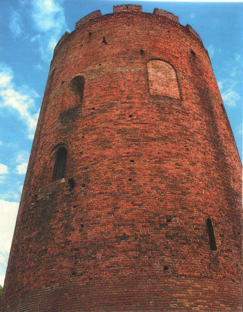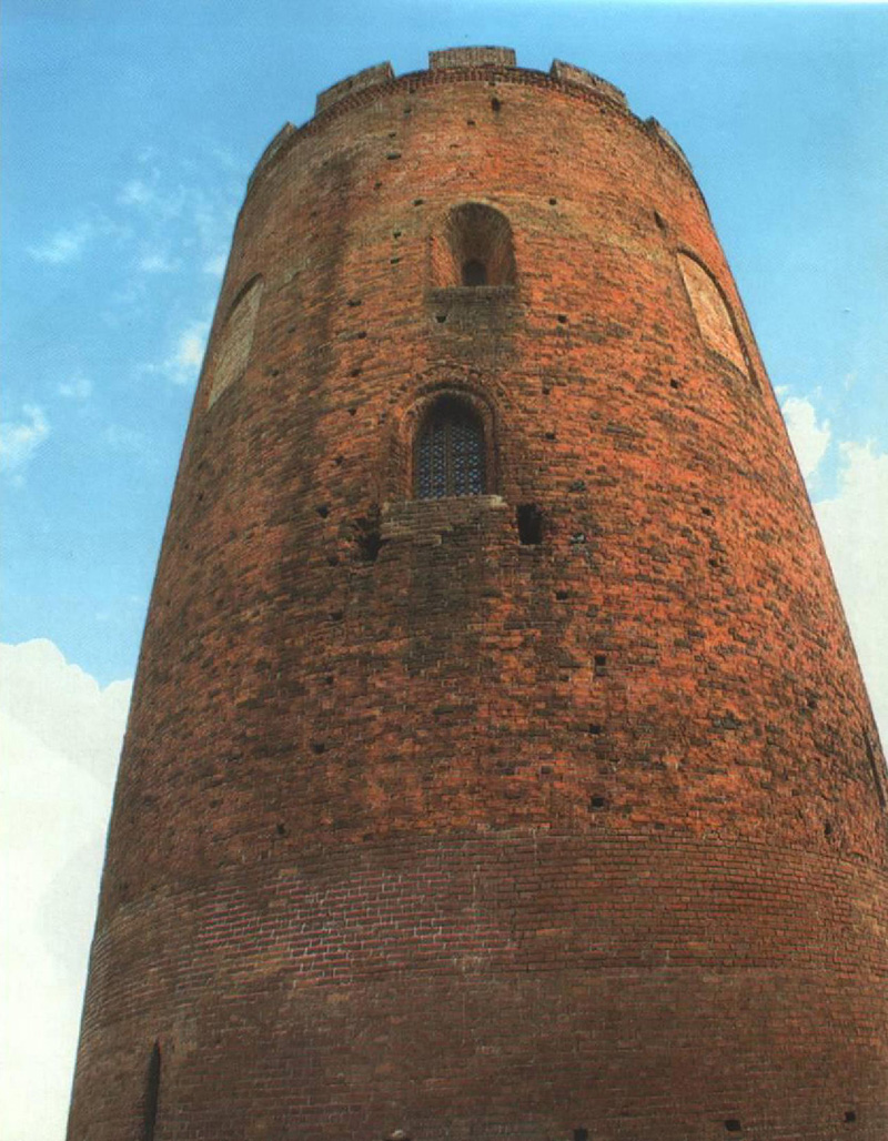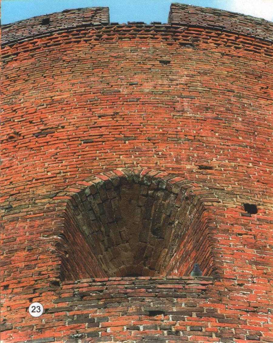 Башни, подобные Каменецкой, были также в Берестъе и Гродно; две сохранились возле Холма, однако они значительно скромнее Каменецкой по размерам и архитектурно- строительным качествам. В кладке Каменецкого столпа, в отличие от Холмских, не применялся природный камень. Для сооружения потребовалось почти полмиллиона штук кирпича размером около 26,5x13,5x8 см, темно-красного и желтоватого цвета. Для лучшего сцепления с раствором кирпич имеет на одной плоскости продольные борозды (как будто от пальцев руки). Высоким качеством отличается и кладка на известковом беловато-сером растворе, толщина швов 2—4 см. Для связывания рядов кирпичей в них чередуются два «ложка» и один «тычок» (балтская или вендская кладка). В стенах башни за много столетий не возникло значительных повреждений от природных воздействий. Стены кверху немного утоньшаются, образуя снаружи небольшой наклон к вертикальной оси. Они не имеют никаких горизонтальных или вертикальных членений, прорезаны только окнами-бойницами, лишь в самом верху башня опоясана четырьмя рядами поребрика, В первом ярусе — две бойницы, во втором и третьем — по три, в четвертом — две и большой проем, обращенный скромным готическим порталом. Это, вероятно, древний вход, обращенный в сторону реки, к нему позже приделали балкон. В пятом ярусе четыре бойницы с расширением внутрь и наружу, а между ними плоские ниши с полуциркульным завершением, которые некогда штукатурились и белились. Ступени в стене, начинаясь с третьего яруса, выводят на верх башни с 14 зубцами, в каждом из которых небольшое отверстие, служившее для наблюдения при вражеском обстреле. Снаружи и внутри в кладке стен осталось множество регулярных углублений для закрепления строительных лесов.