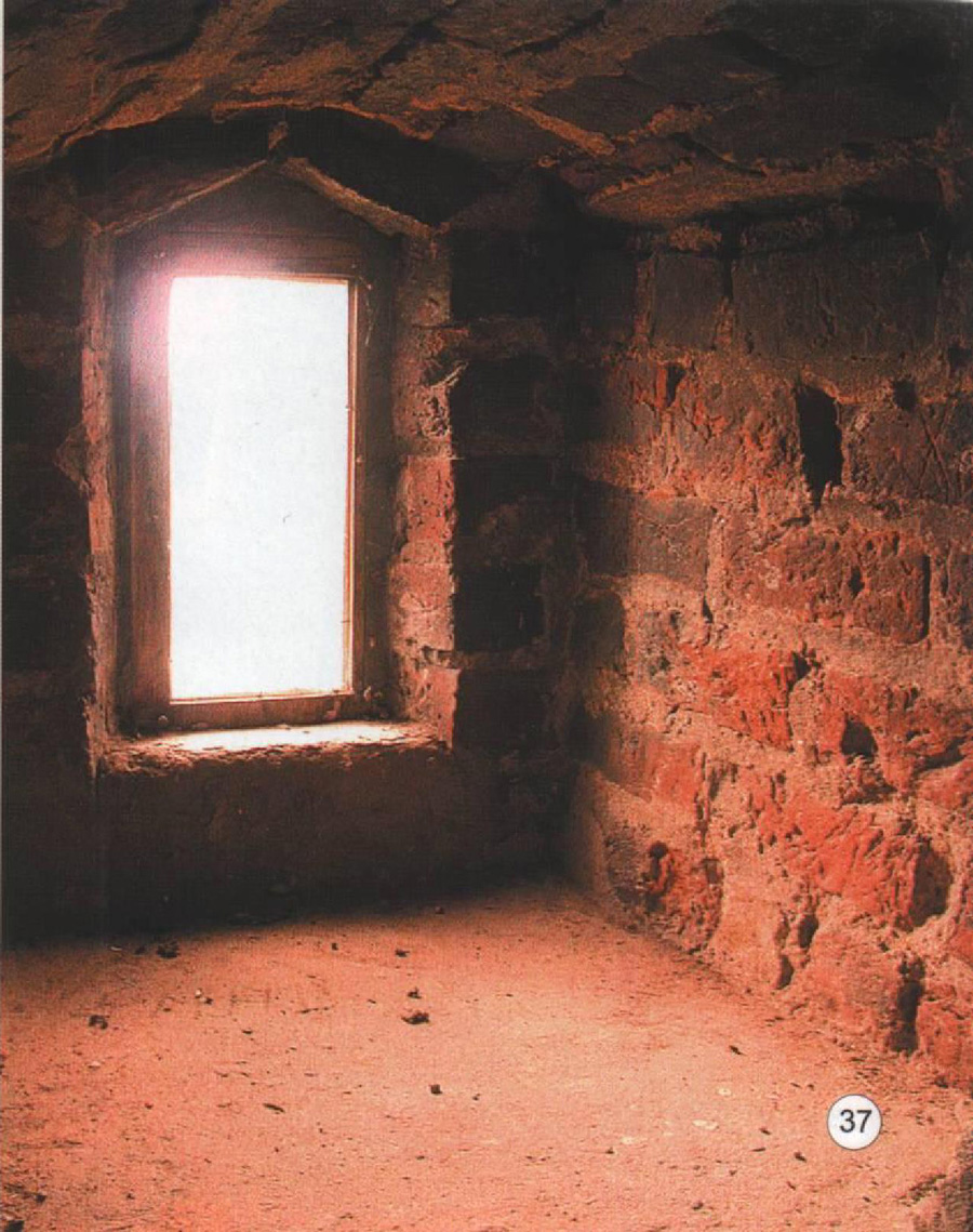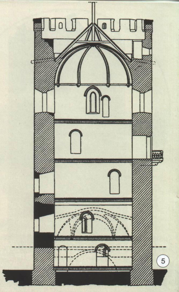 Балабанович насчитал в башне четыре этажа, включая подвал с уцелевшим сводом и круглым отверстием посредине. Ход в подвал ничем не закрывался. Вход во 2-й этаж по распоряжению станового пристава был забит досками, однако дети все же выносили оттуда кирпичи. Автор заметил следы штукатурки внутри верхнего этажа. Он описал расположение окон по этажам и их форму. «Лет 20 назад (в середине XIX в.) башня была еще обнесена оградою, от которой не осталось и следа. Теперь вокруг башни грязь и нечистоты, которые делают неудобным само обозрение ее. Нечистые животные находят себе приют в погребе и выкрошившихся частях внешних стен».