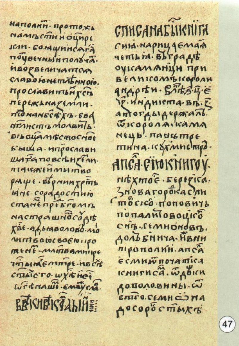 С древним Симеоновским храмом, скорее всего, связана замечательная Четья-Минея 1489 г. [«Четьи-Минеи» — сборники житий святых, составленные по месяцам], списанная поповичем Березкою из Новогрудка и хранящаяся ныне в Киеве. В ней на одной из страниц надпись киноварью указывает место написания, имя и происхождение писца: «Списана бысть книга сия, нарицаемая четья въ граде оу камянци при великомъ короли андреи в лето 6997; а тогды держалъ от короля камянец панъ третина кухмистръ, а писал сию книгу березка с Новагородка с Литовского поповичь попа литовоцкого с(ы)нъ Семионовъ Долъбнича и в митрополии а п(и)сал есми от початка книги сам от дошки до половины от с(вя)того семиона до сорок с(вя)тых...». Странным кажется в надписи упоминание короля Андрея, ибо королем в 1489 г. был Казимир Ягеллон. Но запись в краткой «Хронике Великого княжества Литовского» (Ольшевский кодекс): «...король Андрей Казимир умер лета (от) божьего нарожения 1500» — указывает нам, что Казимир Ягеллон имел и второе имя. Известный киевский профессор Н.И. Петров считал, что в надписи речь идет о Каменце Литовском (найдена рукопись неподалеку, в Седлецкой губернии). Он отмечал наличие в церковнославянском тексте южнорусских (украинских) и белорусских слов, что характерно для Брестского региона. Безоговорочно считал рукопись «западнорусской» ЛИ. Соболевский. На причастность к созданию книги Симеоновской церкви (находившейся если уж не в Каменце, то не далее как в Бресте, где издревле существовал православный монастырь Святого Симеона Столпника) может указывать то, что отца писца, священника церкви в Литовке (близ Новогрудка), звали Симеон Долбнич, а начал Березка работу в день Святого Симеона.