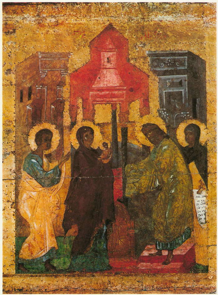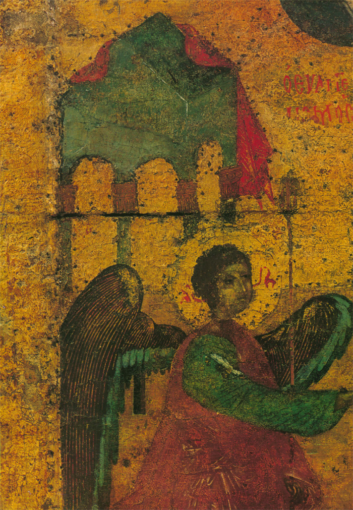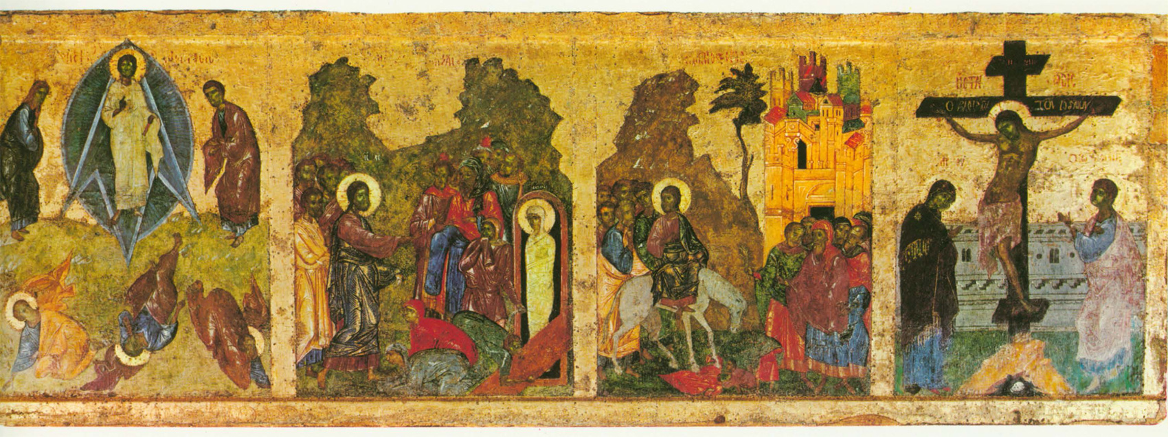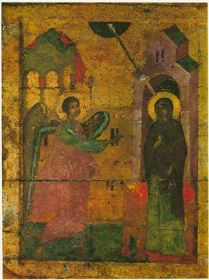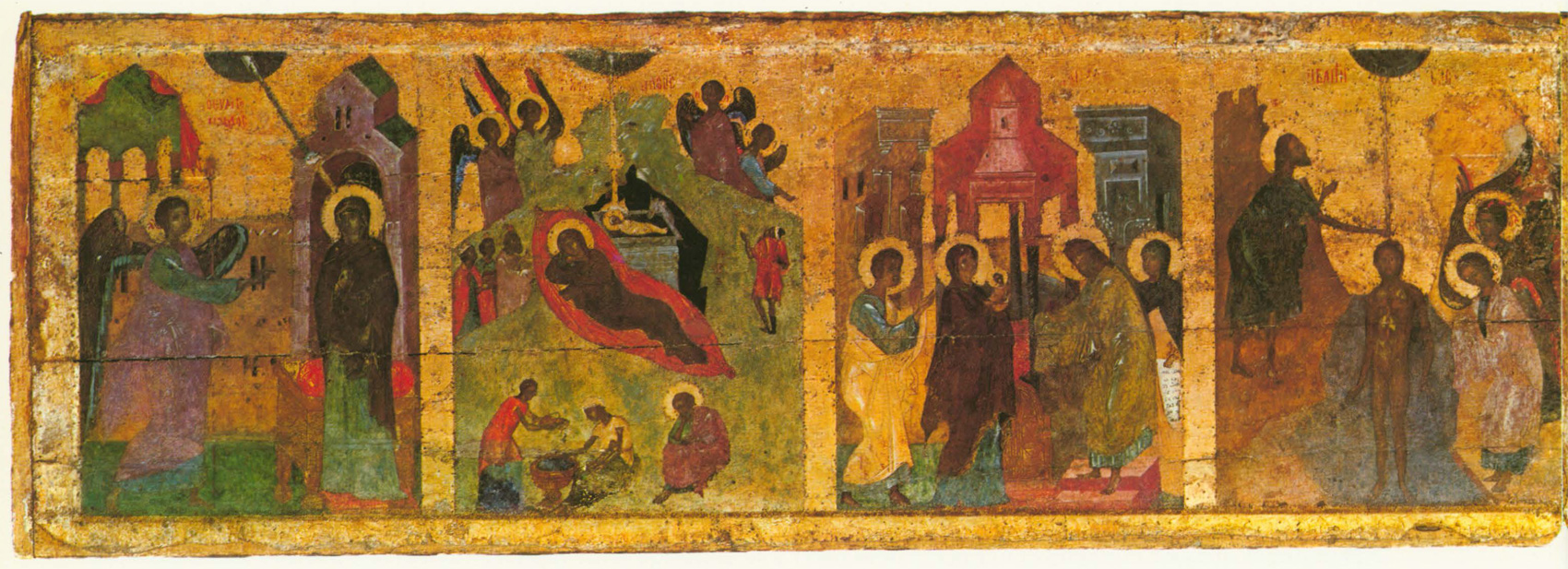 Первый сюжет из «праздничного» ряда — «Благовещение». Его колорит решен с доминантой сиреневых тонов. Даже стена между фигурами, написанная в неопределенном коричневом разбеленном тоне, имеет дымчатосиреневый оттенок. Зеленовато-голубой цвет в деталях одежд архангела и Марии, а также зелено-синеватый оттенок архитектурного фона усиливают сиреневатость всех остальных колеров. Ту же роль играют небольшие киноварно-красные пятнышки велума, подушки, сапожек Марии и пряжи. Безусловно на оттенение сиреневых тонов «Благовещения» рассчитано основное цветное пятно — голубовато-зеленоватая горка в композиции «Рождество Христово». Сиреневые, красные и темные пурпурные тона одежд применены здесь для выявления преобладающего голубовато-зеленого цветового решения. Голубизна и зеленоватость цветовых оттенков в этой композиции подчеркнуты пятнами ярких розовых и красных тонов в общем приглушенном строе следующей композиции — «Сретение». Слегка приглушенный колорит всех тонов, кроме светло-желтой охры гиматия Иосифа, разрывается ярко-розовыми пятнами крупного кивория в центре композиции и подножия — солеи под ногами Симеона. Как в сгусток, розовые тона собраны в центре в ярко- красный цвет престола. В эту гамму художник смело вводит серый цвет (портик за Симеоном и Анной), серый же тон отделяет красноту престола от желтой охры стены позади него. Утемненная и приглушенная гамма правой группы как бы противостоит более яркому цвету левой, зеленые тона одежд и позема подчеркивают звучность яркого розового и красного цветов. Светло-желтый мягкий тон гиматия Иосифа не осветляет общий колорит композиции, а скорее, подчеркивает сумеречность ее правой группы, создающей переход к скупому цветовому решению очередного сюжета — «Богоявление» («Крещение»). Когда-то на фоне коричнево-сероватых тонов яркий, но темный синий цвет реки Иордан должен был выделять коричневатую фигуру Христа в центре. Предтеча в темных синих и голубых одеждах гармонично сливался с коричнево-дымчатым тоном горки. Темному колориту левой половины композиции противопоставлены яркие одеяния ангелов и желтовато-розоватая горка за ними. Они, как солнечным бликом, вырваны из общей стемненности колорита. На смену сумеречному «Богоявлению» следует яркое зеленое и голубое «Преображение» (на второй, средней доске). Зеленая горка и золотой с зеленым отливом фон выгодно выделяли яркие голубые и синие тона сияния вокруг фигуры Христа, одетого не в белые, а зеленоватые одежды. Цветные одеяния апостолов — желтые, сиреневые, голубые, синие и темно-серые — оттеняют чистую голубизну мандорлы и лучей вокруг фигуры Христа.