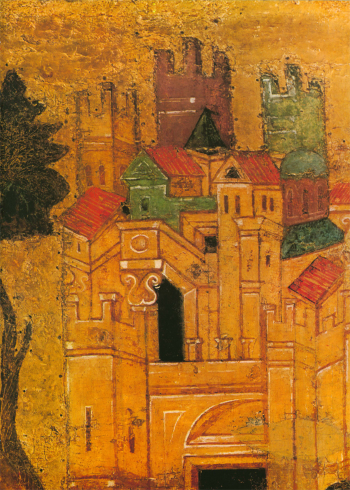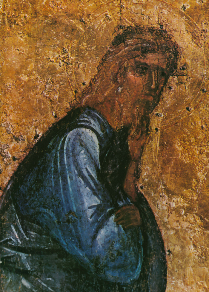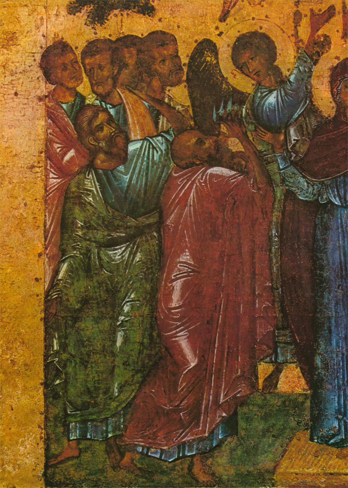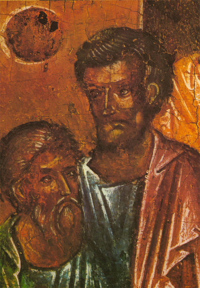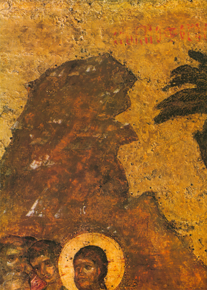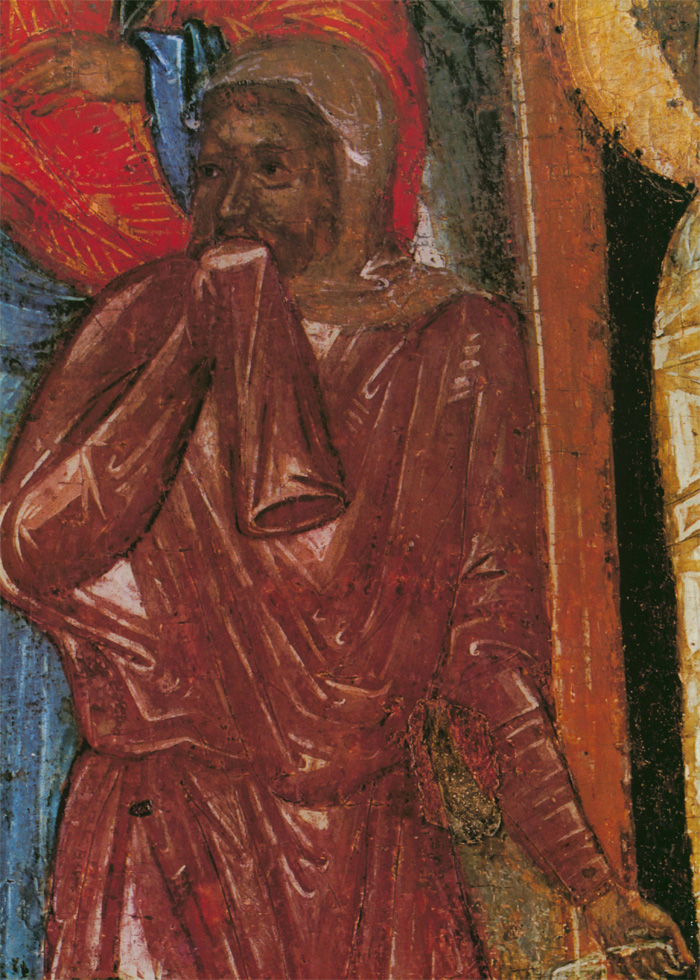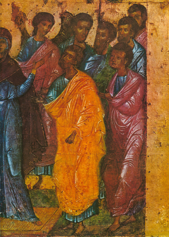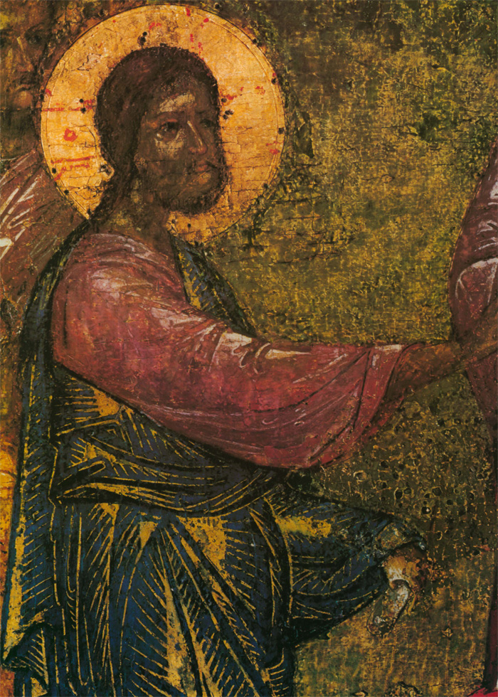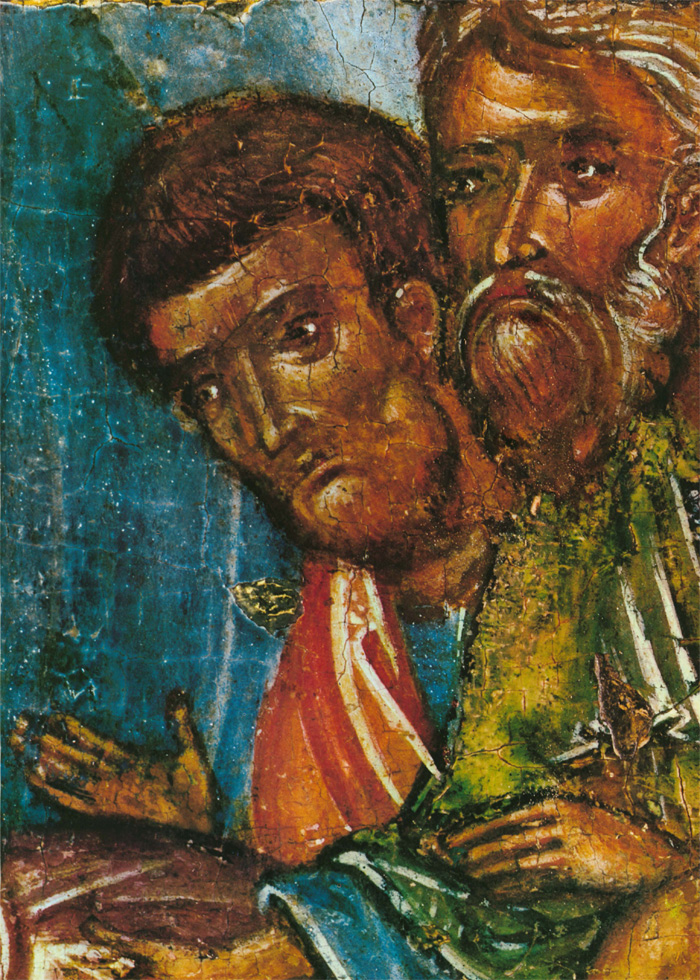 Второй мастер также тяготеет к искусству Византии и Балканских стран, его живопись по колориту напоминает миниатюры псалтири Томича. О том, что художник этот не монументалист, свидетельствует нечеткое распределение декоративных пятен: его живопись не рассчитана на восприятие с большого расстояния. Может быть, это один из тех новгородцев, которые переписывали книги в Студийском монастыре под Константинополем или в одном из монастырей на Афоне, а в Новгороде украшали миниатюрами рукописи во владычной мастерской. Этим вторым мастером, тяготеющим к миниатюрной живописи, в основном написаны «Вход в Иерусалим», «Воскрешение Лазаря» (кроме группы с Христом) и «Сошествие во ад». Он участвовал в написании группы ангелов в «Богоявлении» и, вероятно, им же написана фигура Иоанна в «Распятии». Может быть, он исполнял и второстепенные детали композиции «Благовещение» и других. Рисунок фигур диспропорционален: несколько крупные головы и укороченные ноги. Под складками одежды изограф совсем не передает тело человека. Ему трудно решить композицию колористически. Он, например, изображает зеленые и серо-зеленые одежды на фоне зеленых же поземов или горок. Контрастные и противоположные тона сочетаются у него негармонично, что создает ощущение пестроты. Вероятно, его привычка иллюминировать рукописи, которые рассматриваются на близком расстоянии, сказывается в излишней подробной прорисовке деталей. Так, изображая дерево в композиции «Вход в Иерусалим», мастер рисует детали кроны тончайшими золотыми линиями, пользуясь сложным техническим приемом. Но филигранная разработка листвы совершенно не воспринимается зрителем даже на небольшом расстоянии. В то же время ассистная (линейная) разработка золотой инокопью (золотыми штрихами) складок одежд в этих же композициях графична, широка и часто не выявляет, а наоборот, нарушает форму складок драпировок. Возможно, что ассистку делал не этот мастер, а скорее всего, так называемый третий. Этот технический прием в иконописи не связан непосредственно с живописным процессом, а является его завершением. Поэтому наложение золота могло быть поручено одному из мастеров, обладающему талантом не живописца, а графика. (Следует заметить, что рисунок ассиста в «праздниках» перекликается с трактовкой его на «Васильевских вратах» 1336 года.) Мастером этим мог быть тот, чья работа преобладает в композициях «Сошествие св. Духа», «Успение», частично в некоторых фигурах «Вознесения». Бесспорно, он обладает мастерством графического, линейного выражения, но у него отсутствует чувство декоративности цвета, проявленное первым мастером. Особенность его дарования выявляется в линейно-графической трактовке складок одежд. Белые пробела одежд с острыми изломами складок, такие же белые высветления ликов с острыми прямыми линиями носов свойственны композиции «Успение» и некоторым фигурам в «Вознесении». В лицах, написанных третьим мастером, безусловно воспроизведен русский типаж. Любовь изографа к сочетаниям открытых, чистых, звучных тонов заставляет вспомнить творчество новгородских художников рубежа XIII—XIV веков. В то же время в композиции «Успение» (в правой ее части) живописные отношения сложнее, гиматий фигуры Павла написан с характерным приемом двухцветия (по пурпурно-сиреневому тону — зеленовато-голубые