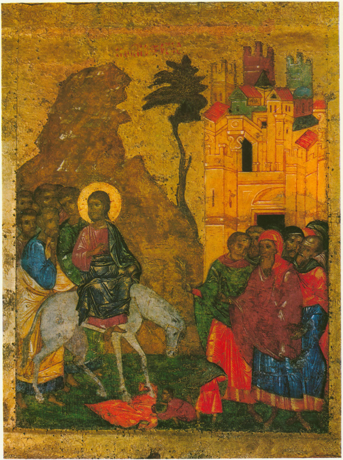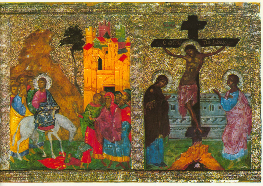 Следующие две композиции — «Воскрешение Лазаря» и «Вход в Иерусалим» — решены в сумеречных тонах с преобладанием коричнево-дымчатых и темных серо-зеленых тонов. Пестрые одежды толпы, ярко-красные, голубые, синие, зеленые, желтые, коричнево-розоватые и другие, не осветляют колорит из-за их приглушенной светосилы. Два главных канонических элемента выделены художником: фигура Христа, акцентированная диском золотого нимба и ассистом на синем гиматии, да светлая зеленовато-белая вертикаль запеленутого тела Лазаря на черном фоне дна саркофага. Огненно-красным цветом художник пишет коленопреклоненную фигуру одной из сестер Лазаря — композиционно связующее звено между Лазарем и Христом. Примыкающую к «Воскрешению Лазаря» часть композиции «Входа в Иерусалим» художник решает аналогично, как бы связывая оба события в единое целое, разделяя сцены только золотой вертикалью разгранки. В правой же половине «Входа в Иерусалим» он выделяет светлыми тонами город Иерусалим, подчеркивая его идейно-символическое значение не реального, а «Горнего Иерусалима» — рая. Этим высветлением он создает переход к следующей части фриза, «Распятию», где на золотом с зеленоватым блеском фоне резко вырисовывается темный силуэт креста с распятым Христом.