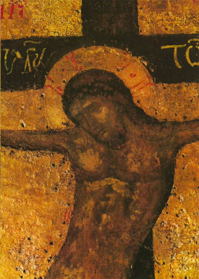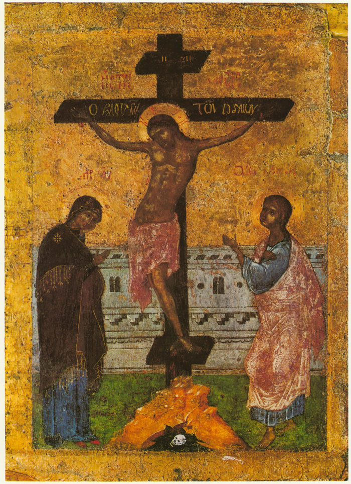 Эта композиция отличается лаконизмом и подчеркнутой центричностью. Скорбно-торжественную ноту вводят сюда монохромность серой стены и темно-багряный силуэт богоматери. Даже светло-сиреневые разбеленные тона гиматия Иоанна и его голубой хитон, как и желтая горка под крестом, не вносят цветовой мажорности, а лишь оттеняют свинцовую монохромность серых, темно-коричневых и темно-синих тонов, усиливая чувство скорби, выраженное в позах предстоящих кресту.