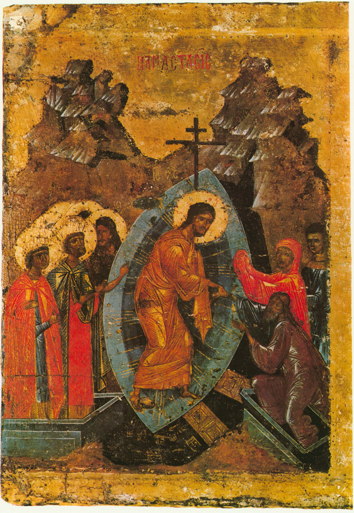 Эпически скорбному «Распятию» противопоставлено «Воскресение с сошествием во ад» с его прихотливо изрезанными очертаниями горок. Близость же его по цветовому решению к «Воскрешению Лазаря» и «Входу в Иерусалим» создает единый ансамбль всех сцен и логический переход от расчленяющего этот цикл «Распятия» к следующим четырем сюжетам. Своеобразную мажорность «Воскресения с сошествием во ад», решенного в несколько сумеречной общей тональности, художник создает с помощью красных одежд и золотых нимбов левой группы праведников. Объединяет обе группы праведников голубая мандорла, заключающая в себе фигуру Христа в золотисто-желтых ризах. В цветовом решении этой композиции особенно четко раскрывается аналогия размеренной гармонии полифонического средневекового песнопения с колористическим строем всех сюжетов фриза.