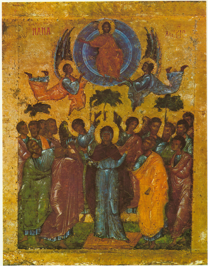 Полная противоположность «Воскресению с сошествием во ад» — «Вознесение» с его откровенно мажорным колоритом, решенным в перламутрово-голубых и сиреневых тонах, создающих сдержанную и изысканную гамму. Отсутствие ярких (киноварных) пятен и доминирование нюансов синих, голубых и сиреневых тонов создает впечатление залитости голубым светом всей сцены.