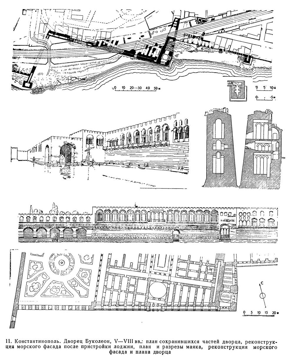 Большой Константинопольский императорский дворец (рис. 9, 10) исследован всё ещё мало, несмотря на то, что изучение его продолжается уже несколько десятилетий. Причина этого кроется в том, что в старой Турции это место было труднодоступным. Кроме того, исследования велись только по временам в зависимости от тех или иных строительных работ, производившихся на том месте, где стоял дворец. Планомерных и систематических исследований дворца до сих пор не велось. Начало таким исследованиям было положено Русским археологическим институтом в Константинополе, но они были прерваны разразившейся первой мировой войной. Результаты проделанной работы либо погибли, либо попали в руки исследователей других стран, которые их продолжали. Несколько больше известно о примыкавшем к Большому дворцу дворце Буколеоне, который был расположен на самом берегу Мраморного моря (рис. 11 и 12).