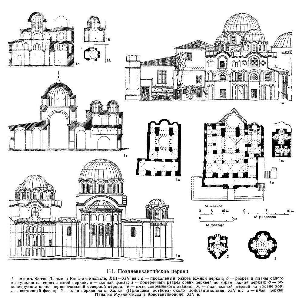 | 107. Константинополь. Церковь монастыря Хора (Кахрие-Джами), конец XIII — начало XIV в.: восточный фасад, детали, план, южный фасад, продольный разрез | |
