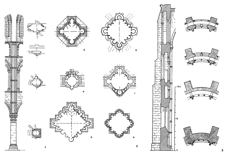 Начиная со второго яруса опоры имеют более дробное членение и состоят из пяти служебных колонн, по профилировке соответствующих профилям нервюр. Все своды и арки имеют стрельчатую форму.